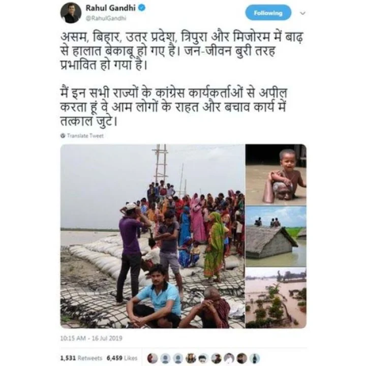 काँग्रेस नेते राहुल गांधी यांनीही एक ट्वीट करून पूरग्रस्तांना मदती करण्याचं आवाहन काँग्रेस कार्यकर्त्यांना केलं आहे. या ट्वीटमध्ये त्यांनी लिहिलंय, "आसाम, बिहार, उत्तर प्रदेश, त्रिपुरा आणि मिझोरममध्ये पुरामुळे परिस्थिती गंभीर झाली आहे. जनजीवन विस्कळीत झालं आहे. या सर्व राज्यातील काँग्रेस कार्यकर्त्यांना आवाहन करतो की, सर्वसामान्य लोकांसाठी मदतकार्यात आणि बचावकार्यात तातडीने सहभागी व्हा."