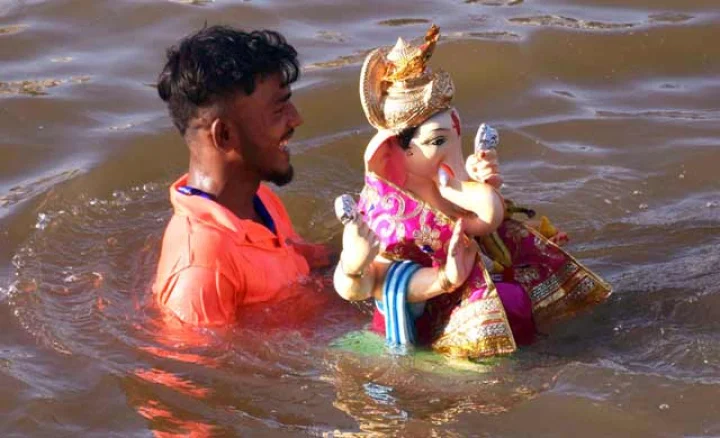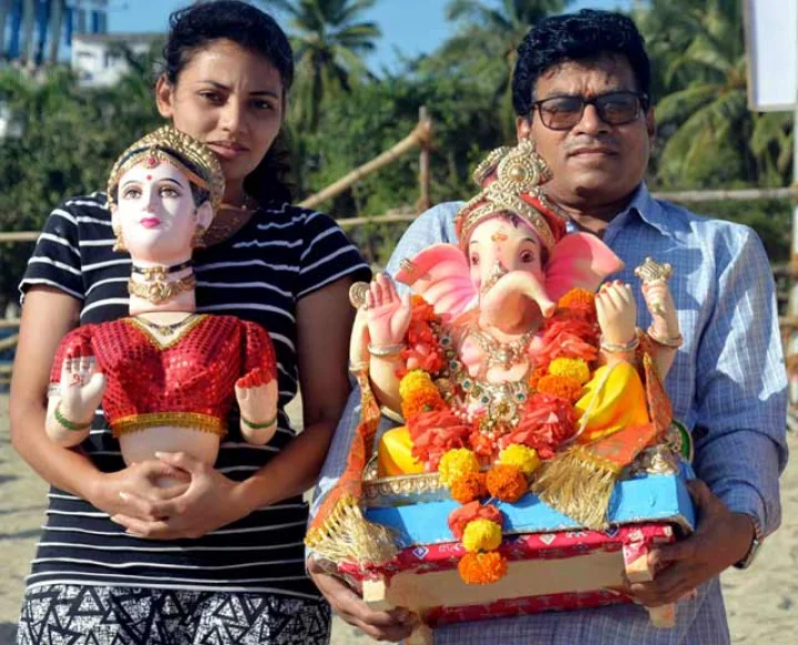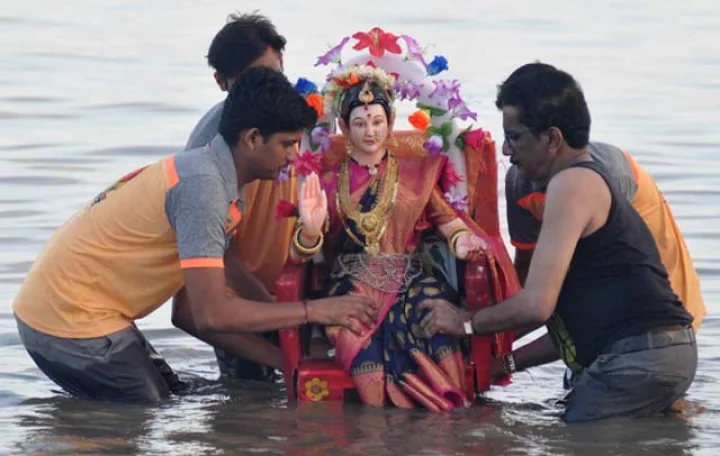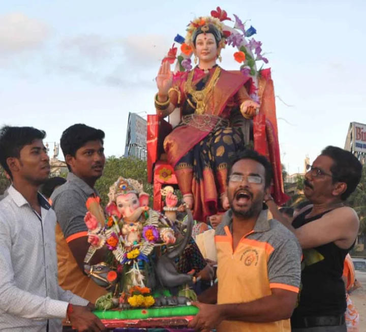 सोमवारी सायंकाळी मुंबई येथे गणेश चतुर्थी उत्सव दरम्यान 5व्या दिवशी मीरा रोडवर गणेशच्या मूर्तीचे विसर्जन आणि पूजा करताना भाविक. फोटो गिरीश श्रीवास्तव